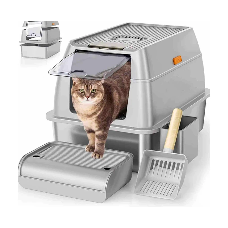 Baño sanitario cubierto de amplio tamaño, diseñado para brindar comodidad a tu gato y mantener la higiene del hogar. Su diseño cerrado con puerta abatible evita la dispersión de olores y mantiene la arena dentro del arenero, mientras que los accesorios incluidos facilitan la limpieza diaria.
