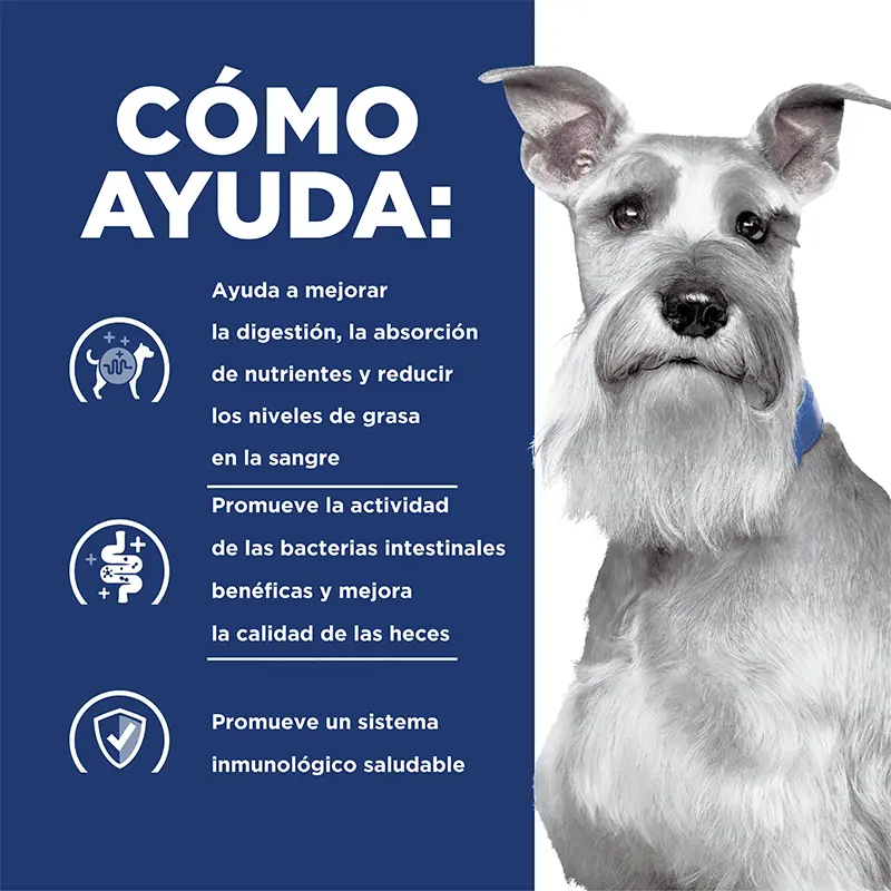 Los niveles inadecuados de grasa en la sangre, la incapacidad para digerir proteínas o la falta de enzimas digestivas producidas por el organismo pueden afectar la salud digestiva de tu perro. Una digestión eficiente es esencial para que tu mascota pueda construir y reparar tejidos, así como obtener la energía necesaria. Por estas razones, es importante alimentar a tu perro con un alimento formulado para ayudar a mantener la salud digestiva.