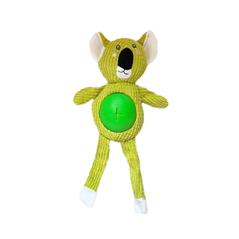 Son peluches de animales coloridos (koala verde, zorro naranja y mono morado) fabricados con tela de felpa acanalada y una cavidad central de goma o silicona flexible para colocar premios o croquetas. El diseño combina materiales blandos y suaves, ideales para juegos interactivos.