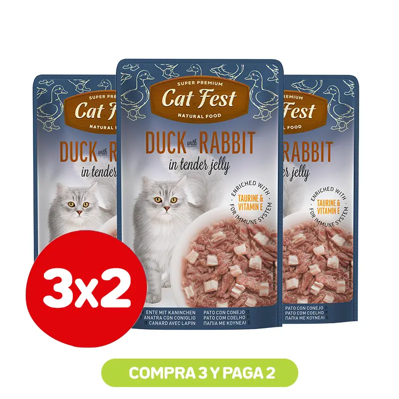 Consiente a tu gato con el exquisito Cat Fest Pato con Conejo en Gelatina Suave.