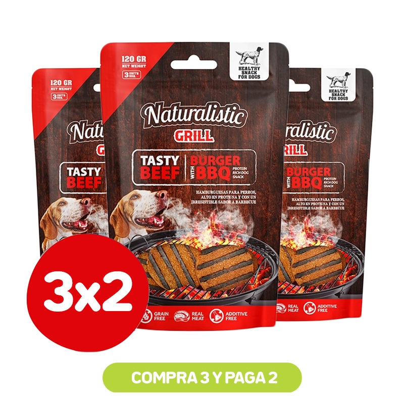 Snack con forma de hamburguesa elaborado a base a proteína de carne de vacuno de alta calidad 100% real. La preparación grillada a la parrilla y su sabor natural a barbacoa la hacen irresistible.