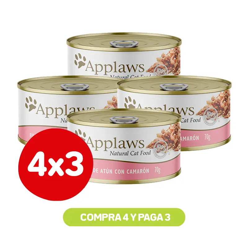 Pack 4X3 Applaws Lata Gato Filete de Atún Camarón con Caldito 70 Gr