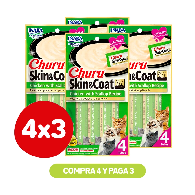 Inicio Alimento Snacks Perros y Gatos Snacks para Gatos Cremosos y Líquidos Pack 4×3 Churu Skin Coat Chicken With Scallop
