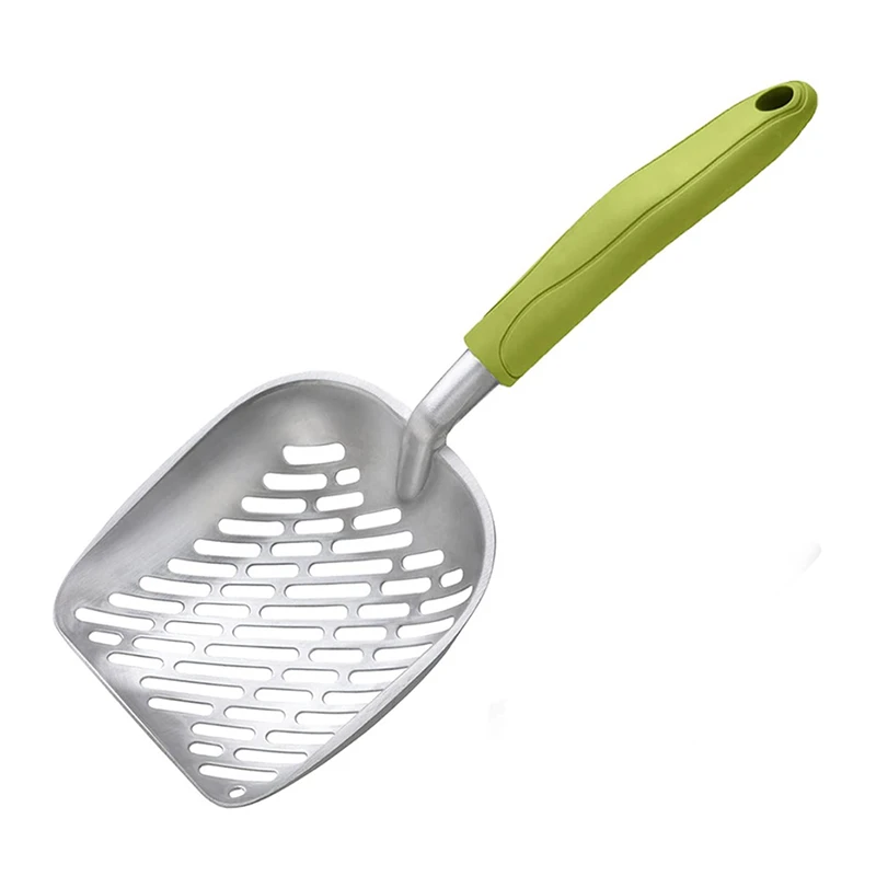 La pala metálica para arena sanitaria es una herramienta diseñada para retirar de forma eficiente los desechos sólidos de la bandeja de arena de gatos. Está fabricada en metal y cuenta con un mango ergonómico recubierto de goma, lo que facilita su manejo y proporciona comodidad durante su uso. Su diseño perforado permite filtrar la arena limpia mientras retiene los grumos y residuos.