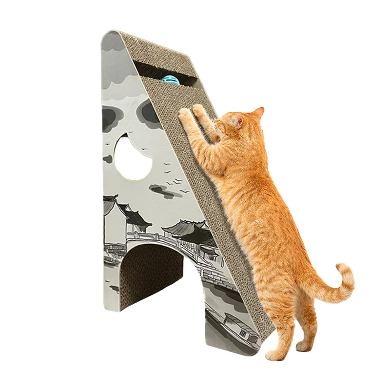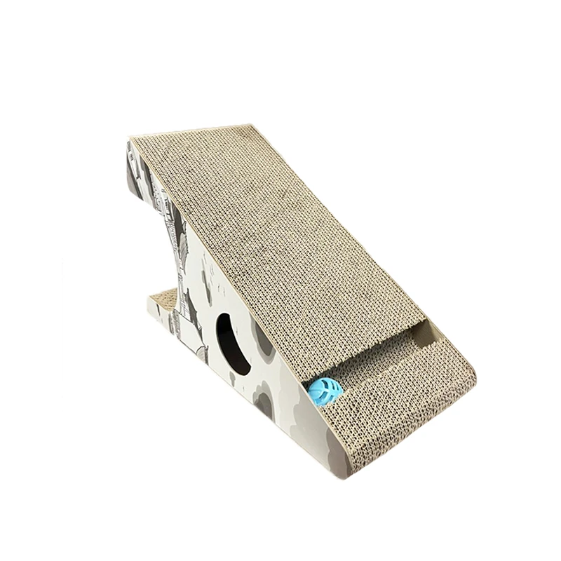 Rasguñador para gatos tipo rampa, ideal para que tu gato juegue, se estire y afile sus uñas de forma natural. Fabricado en cartón corrugado resistente, incluye juguete integrado que estimula el juego y evita el estrés.